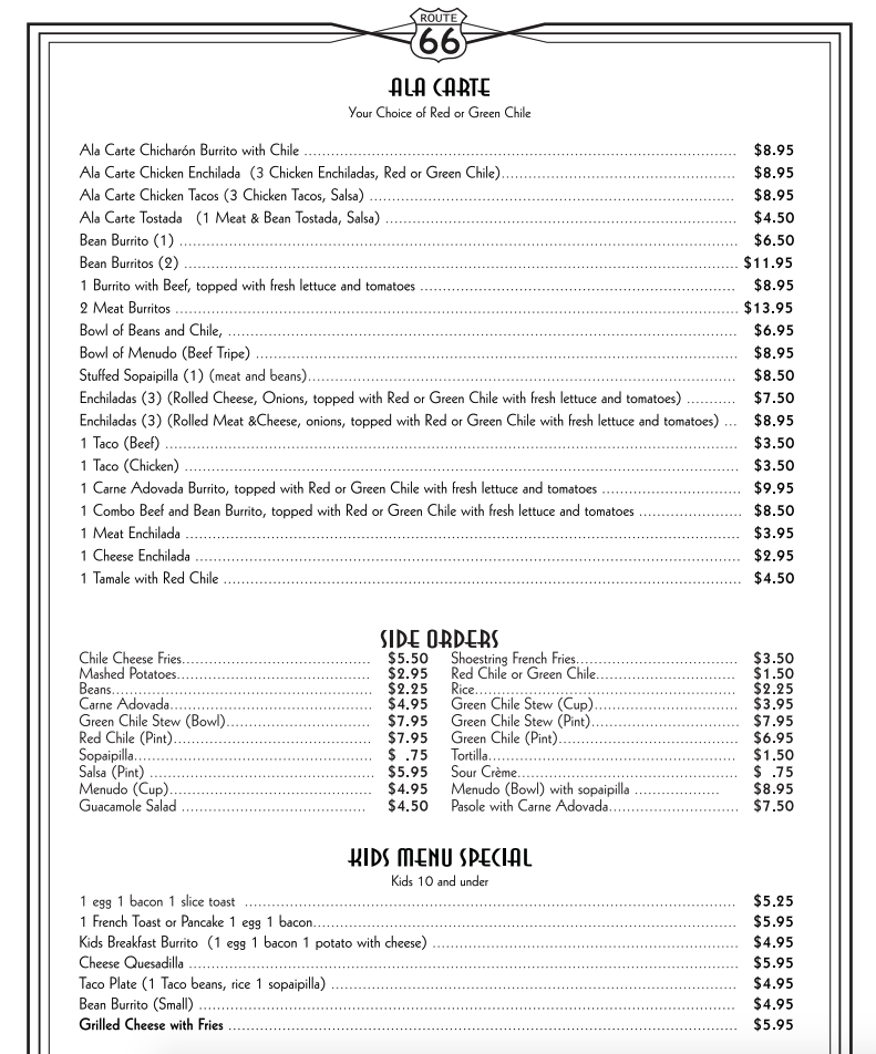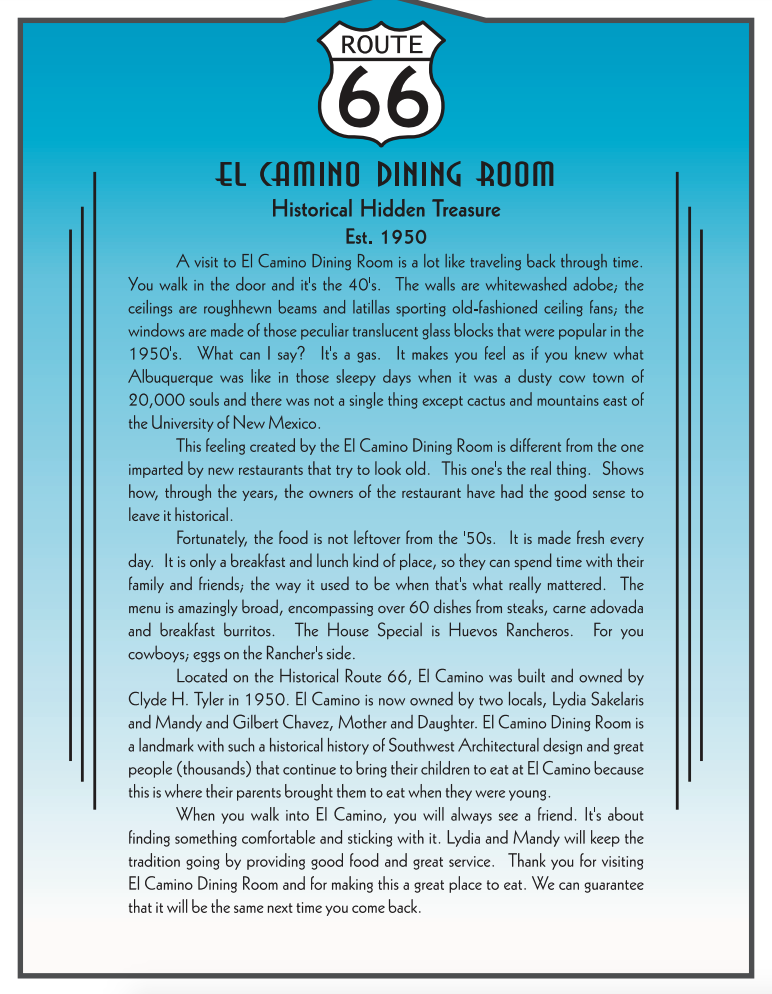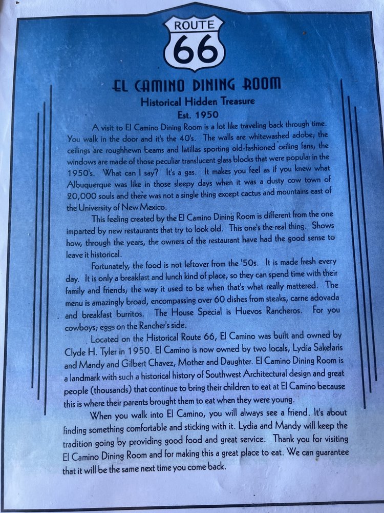 El Camino Dining Room, a charming spot in Albuquerque, offers a taste of nostalgic Route 66 vibes with its classic American comfort foods and generous portion sizes. The menu features New Mexican cuisine, breakfast, and brunch options, catering to various dietary preferences with many vegetarian choices. Customers rave about the flavorful dishes, such as the carne adovada breakfast burrito and Native American Taco, served in ample portions. The friendly staff adds to the pleasant dining experience, with attentive service and a welcoming atmosphere. The restaurant's connection to the Better Call Saul series adds an extra allure, making it a must-visit for fans and food enthusiasts alike. Don't miss out on the opportunity to enjoy a hearty and delicious meal at El Camino Dining Room.